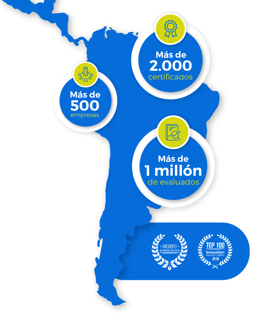 Por último, con orgullo podemos decir que somos una empresa líder en Latinoamérica; ¡nuestro método fue premiado entre los 100 más innovadores por combinar DISC con Inteligencia Emocional y Cognitiva, brindando resultados alentadores que aportan a reducir el porcentaje de rotación en las empresas y a mejorar el desempeño de sus colaboradores! Actualmente, nuestra plataforma es utilizada en más de 500 empresas y en más de 10 países de Latinoamérica y en España, contamos con más de 1300 usuarios activos, hemos graduado a más de 2000 gestores de talento con nuestra certificación y aproximadamente hemos evaluado a más de 1 millón de candidatos.
