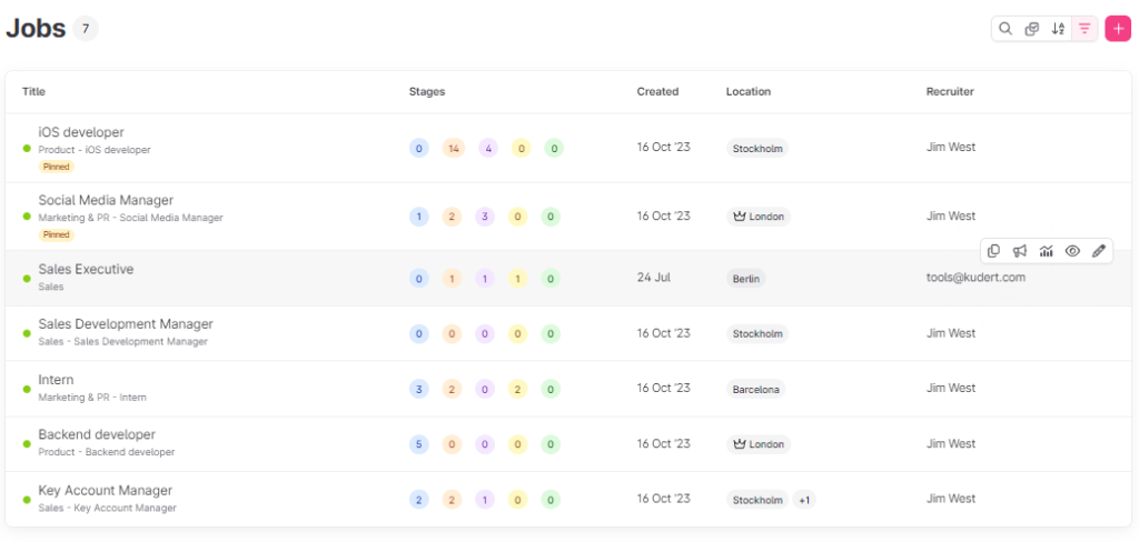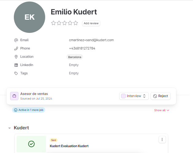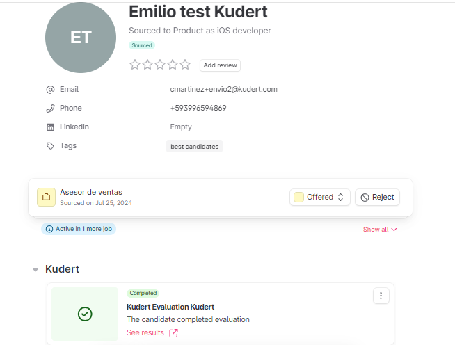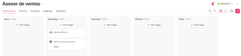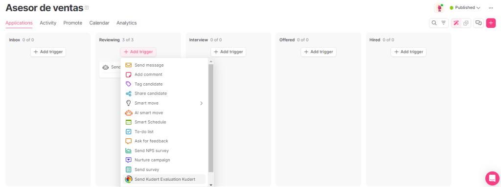 - Una vez identificada la postulación, podrás gestionar el trigger o el activador para enviar las evaluaciones de Kudert.